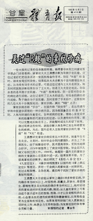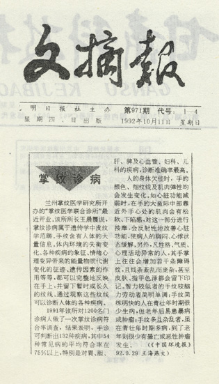 1992年9月22日,《甘肃科技报》报道“国内首家掌纹医学门诊部开诊”
